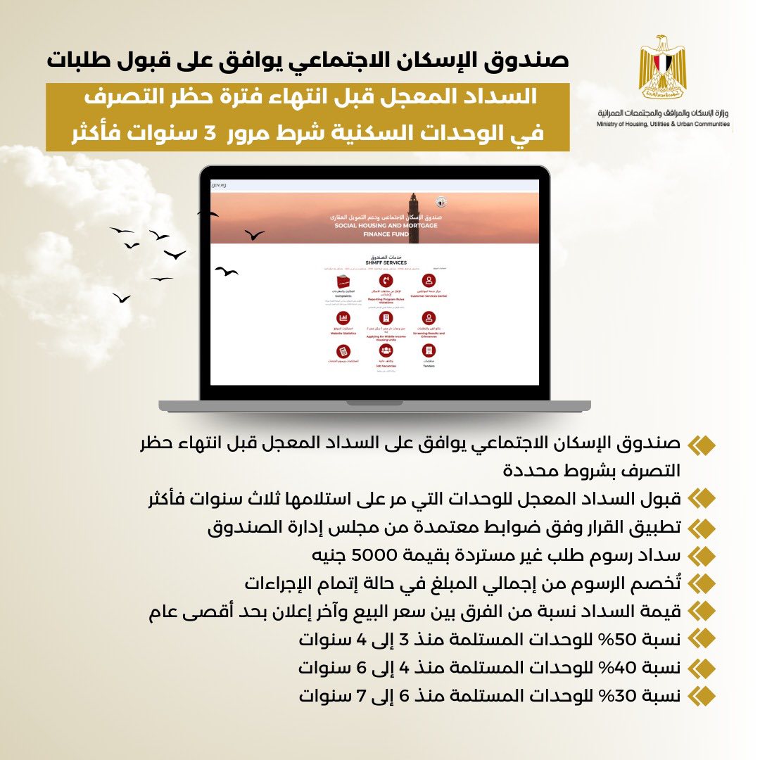 بعد موافقة صندوق الإسكان الاجتماعي، على قبول طلبات السداد المعجل قبل انتهاء فترة حظر التصرف في الوحدات السكنية للوحدات التى مر على استلامها أكثر من 3 سنوات، يتسائل الكثيرين عن طريقة تقديم الطلب ومراحل قبوله.